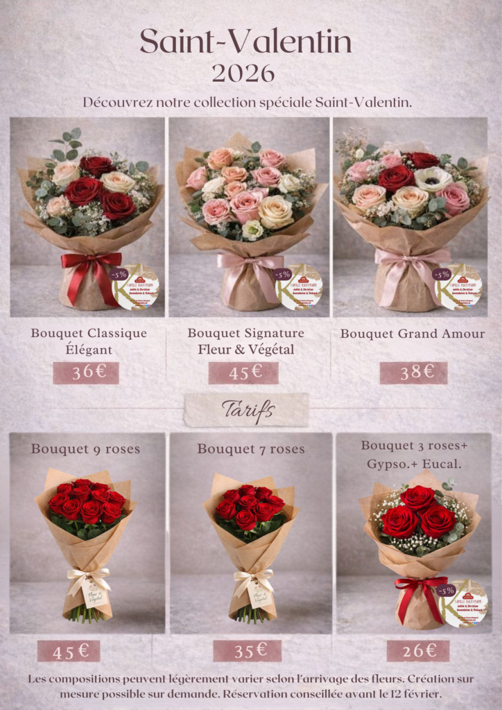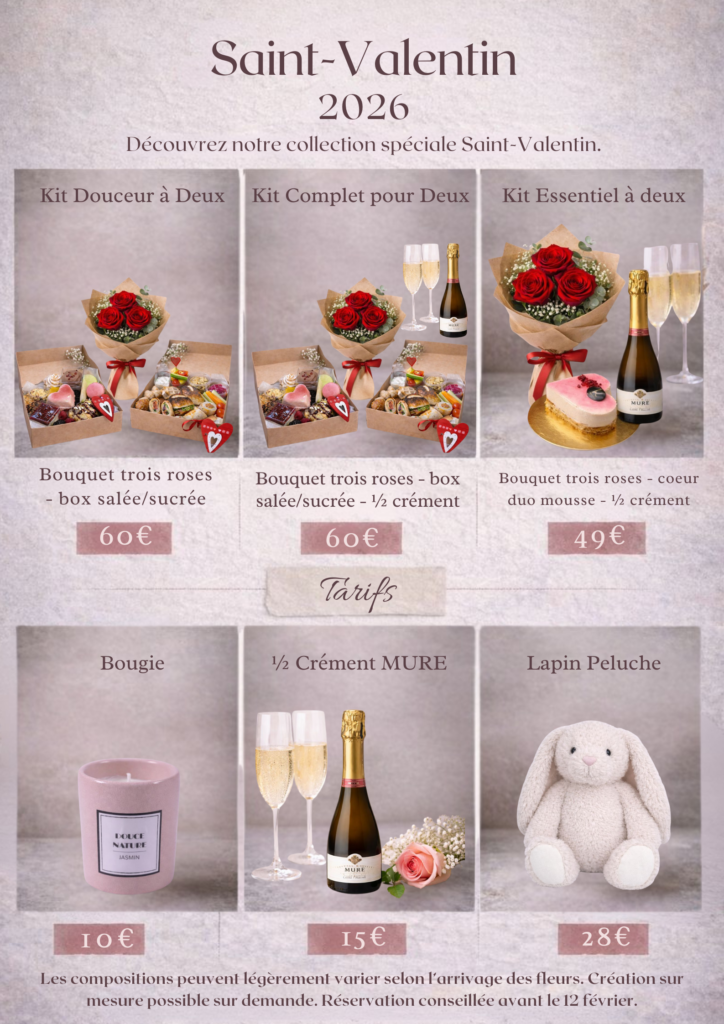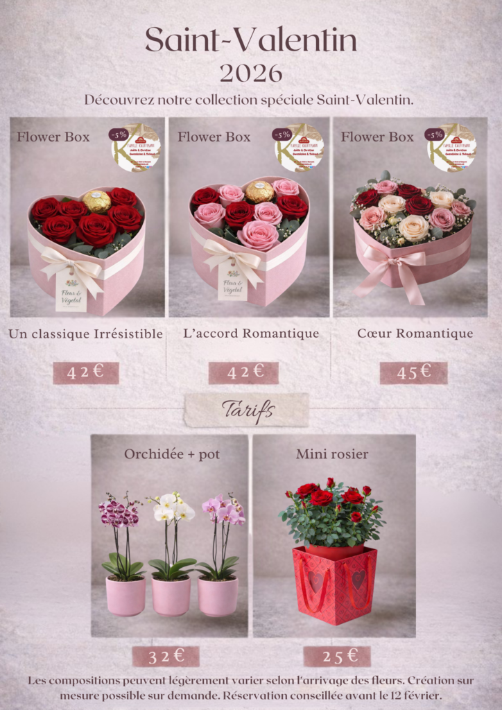 À l’occasion de la Saint-Valentin, Fleur et Végétal vous propose une sélection de créations florales et de cadeaux soigneusement imaginés pour célébrer l’amour sous toutes ses formes. Bouquets, flower box, plantes fleuries et coffrets gourmands sont réalisés en édition limitée, avec le plus grand soin.