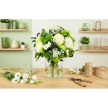 Bouquet de deuil dans des tons blanc et vert composé de fleurs fraîches de saison. Une création florale sobre et élégante pour rendre hommage et exprimer ses condoléances.