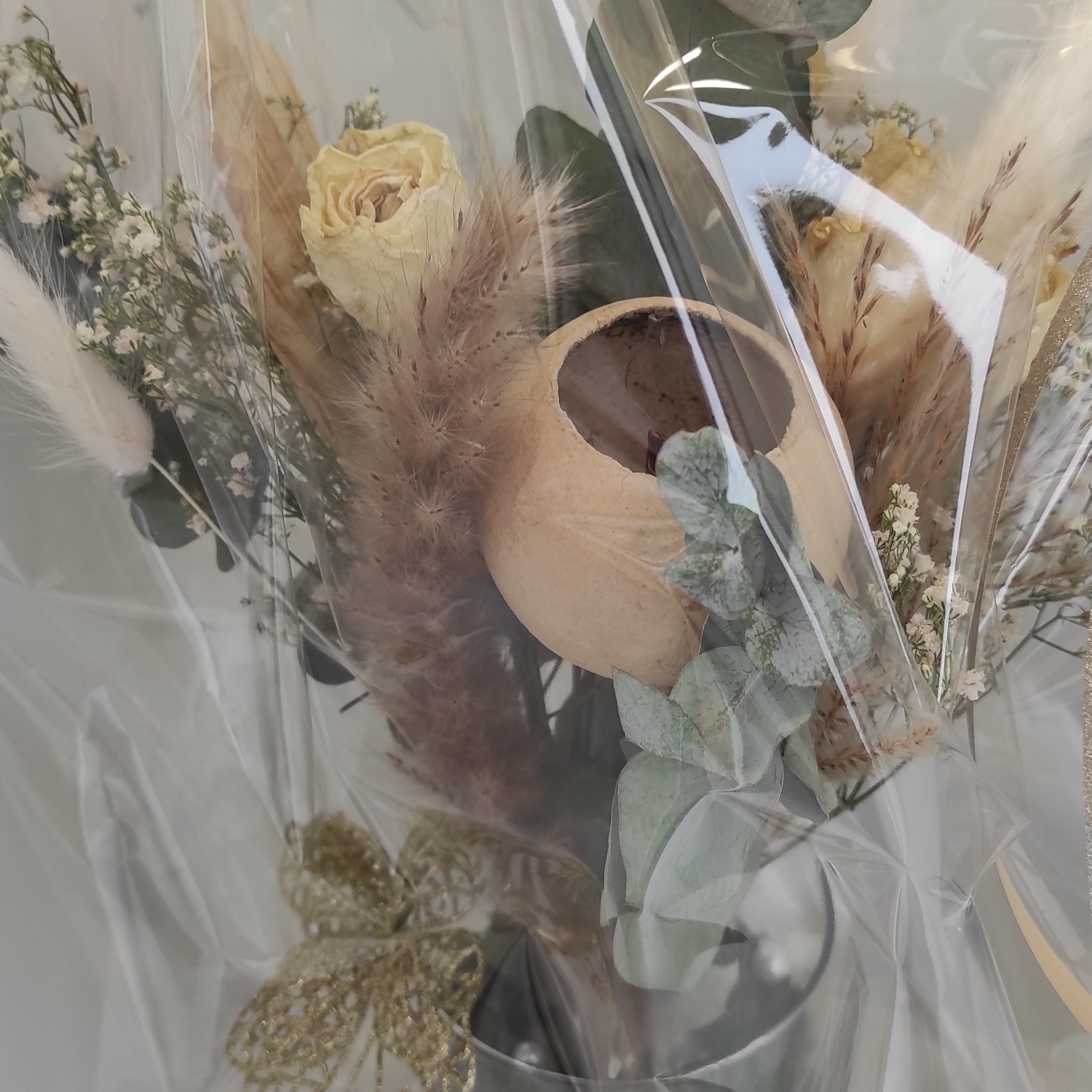 Cette création florale se compose d’un harmonieux mélange de fleurs et feuillages séchés aux tons doux et naturels. Installée dans un vase décoratif aux nuances minérales, elle associe élégamment eucalyptus, graminées, fleurs séchées et éléments texturés pour une ambiance chaleureuse et intemporelle.