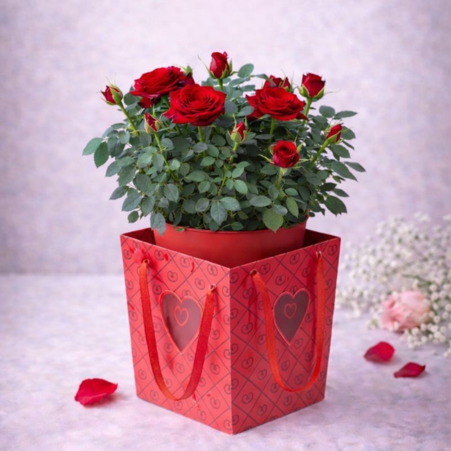 Ce rosier est présenté dans un pot élégant, soigneusement glissé dans un sac cadeau aux motifs Saint-Valentin, orné de cœurs et de détails délicats. Cette présentation prête à offrir apporte une touche festive et romantique, idéale pour surprendre dès le premier regard. Aucun emballage supplémentaire n’est nécessaire : le cadeau est prêt à être remis.